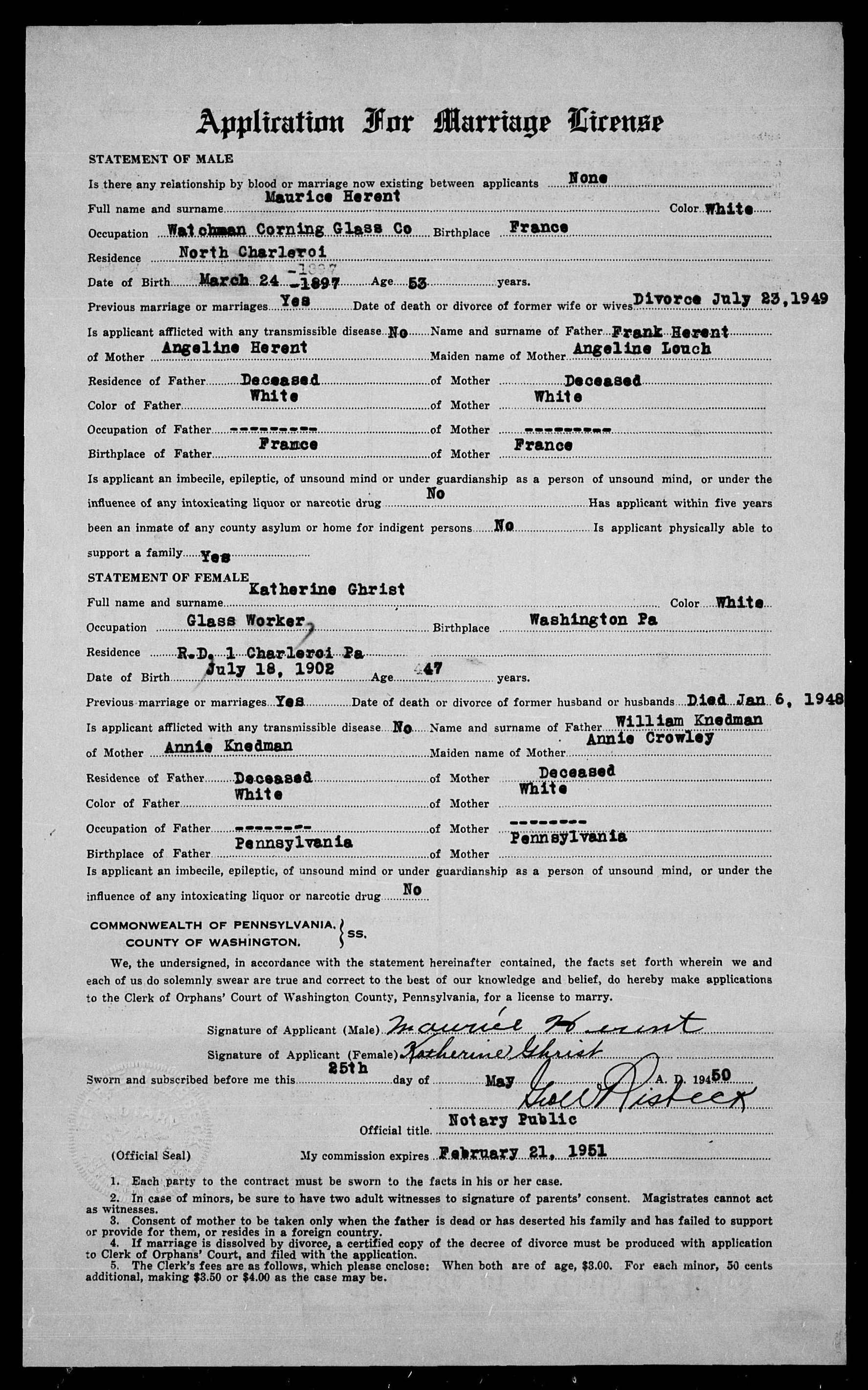 Application for marriage license (1950)