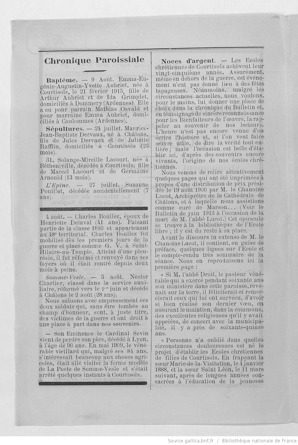 Bulletin paroissial mensuel de Courtisol n°178 (septembre 1915)